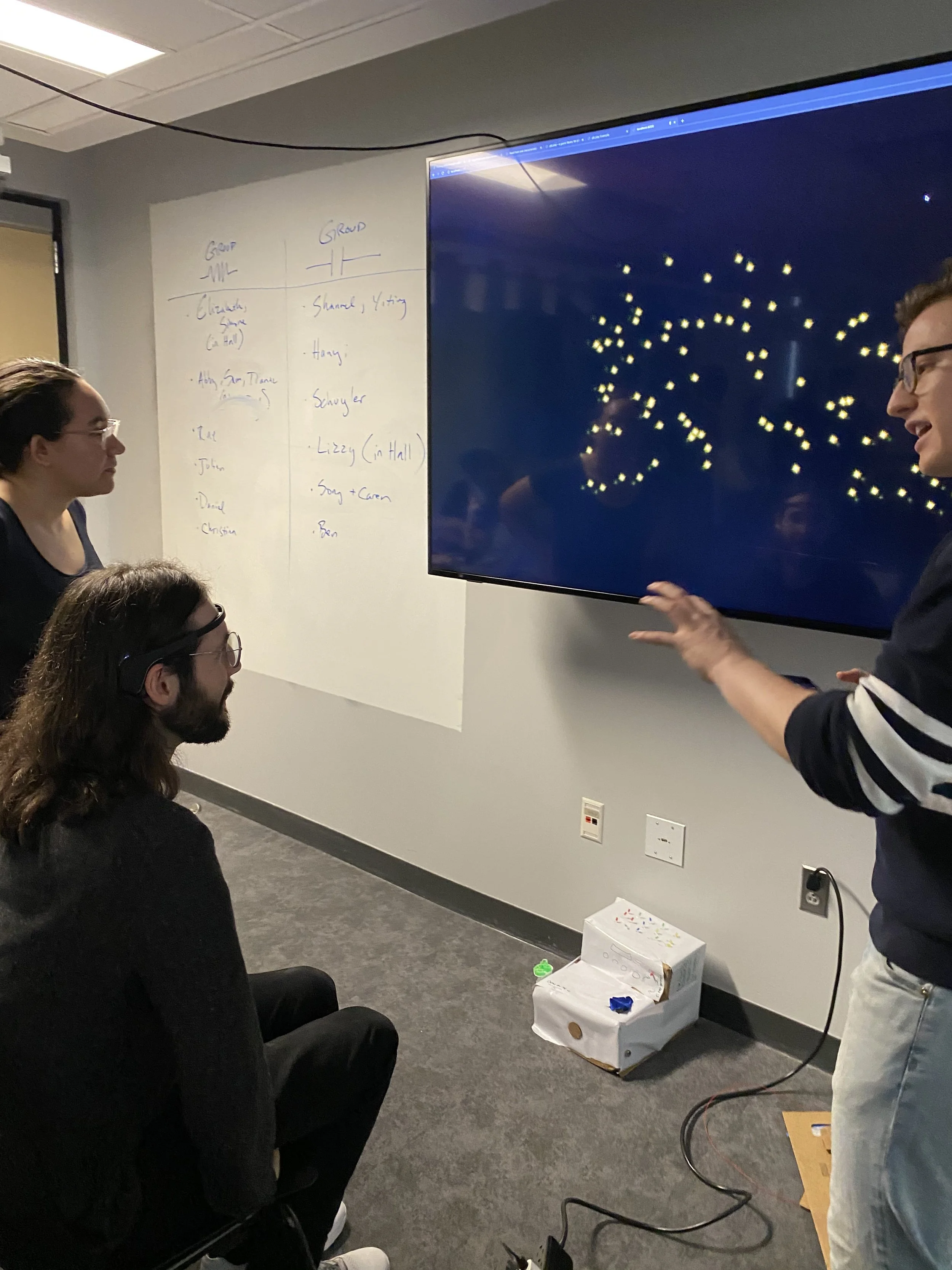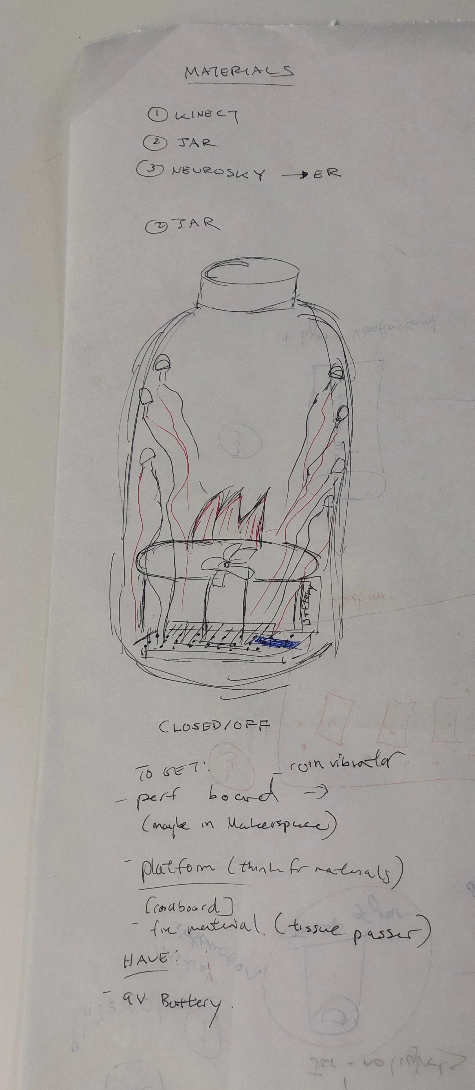 I worked in a group with Sam Krystal and Tianxu Zhou to create a concentration game where users open a jar of “fireflies” onto a digital screen and control the movement of the fireflies onscreen through their own transmitted brainwave data. We utilized a Muse EEG, p5.js animation visible through a projector, and a Bluetooth enabled jar trigger.