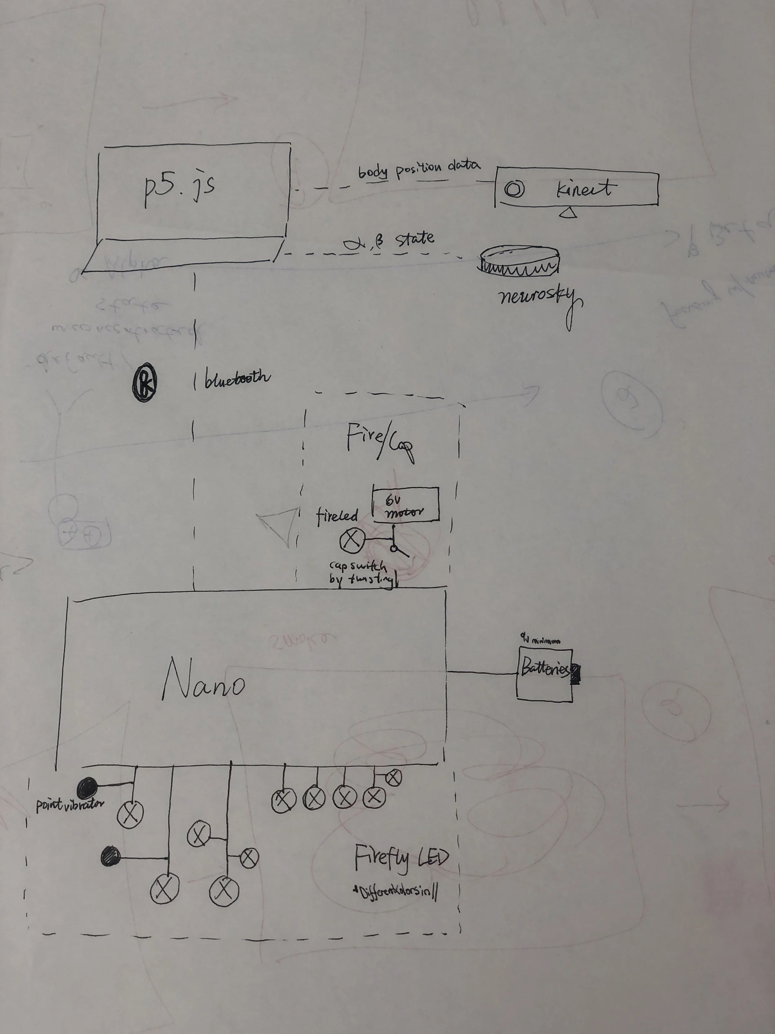 For user testing, we asked users to imagine their silhouette projected onto a p5.js firefly sketch while they wore a prototyped headband representing a Neurosky.