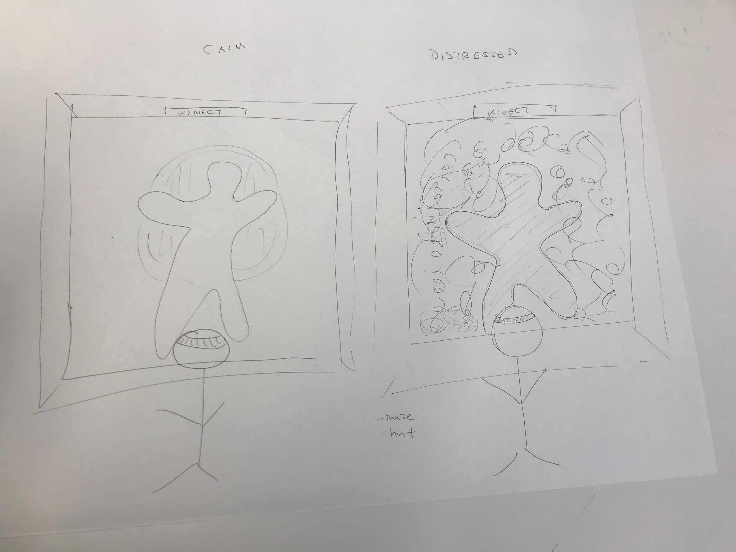 Using a Kinect, a user would see her silhouette onscreen. When anxious, the silhouette is a blob amongst a chaotic background and when calm, the human silhouette with a less chaos.